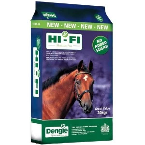 Hi-Fi Molasses Free is suitable for horses and ponies at rest or in light work and horses and ponies that require a low sugar and starch ration that maintain weight with ease. Key Features •Hi-Fi Molasses Free is a low calorie, high fibre feed that provides 8.5MJ/kg DE •Hi-Fi Molasses Free is suitable for horses and ponies that require a low sugar and starch ration such as those prone to laminitis that maintain weight with ease •Hi-Fi Molasses Free contains the added herbs fenugreek and mint for enhanced palatability •Hi-Fi Molasses Free contains no added sugar and naturally provides 1.5% starch and 2% sugar which is approximately one fifth of the sugar found in average hay •Hi-Fi Molasses Free may be used as a partial forage replacementHow to get the most from Dengie Hi-Fi Molasses Free Hi-Fi Molasses Free is a straight feed and although alfalfa is abundant in natural nutrients a source of broad-spectrum vitamins and minerals should be added alongside to ensure a balanced diet such as Daily Vits & Mins or Hi-Fi Balancer. Hi-Fi Molasses Free may be fed dry or dampened with water, or a soaked product such as Dengie Alfa-Beet. To use Hi-Fi Molasses Free as a forage replacement, replace your forage on a weight for weight basis with Hi-Fi Molasses Free.