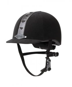 This riding hat comes with glass fibre front reinforcement with a flexible peak to protect against frontal impact. It also has integrated top ventilation which combined with the micro fibre lining helps keep you cool and wick away moisture for extra comfort. The moulded design harness ensures both comfort and stability and combined with a quick release buckle makes it easier for fastening and unfastening. The outer shell is lined with Tech Fab a synthetic suede material that has been treated to protect it from water stain and grease. The well proportioned low profile shape ensures an elegant and refined looking hat. Conforms to EN1384 and ASTMF1163 and SEI certified. Now with BSI kitemark. Black.