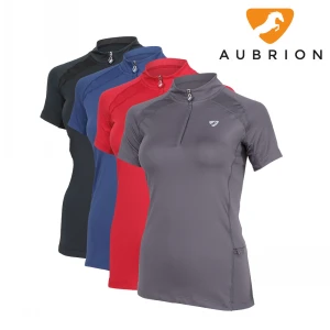 Style detail: short sleeves, fitted shape, flattering rear pleat, soft feel, zip money pocket, Aubrion emblem.